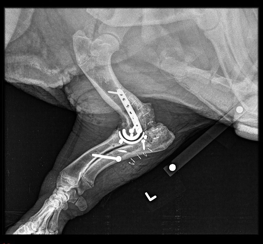 After three months of pain management, rehabilitation and weight loss at the hospital, she was ready for the next big procedure. McOnie’s assembled team decided to replace her arthritic elbow, rather than amputating the limb or fusing the joint, which would have fixed it at a specific angle. “We elected to replace all of the bone and cartilage of the joint surfaces of the elbow, since this is where the pain in her elbow was coming from,” said Selena Tinga, D.V.M. ’12, assistant professor in the section of small animal surgery in the Department of Clinical Sciences. “A successful elbow joint replacement would alleviate her pain while maintaining joint motion.”