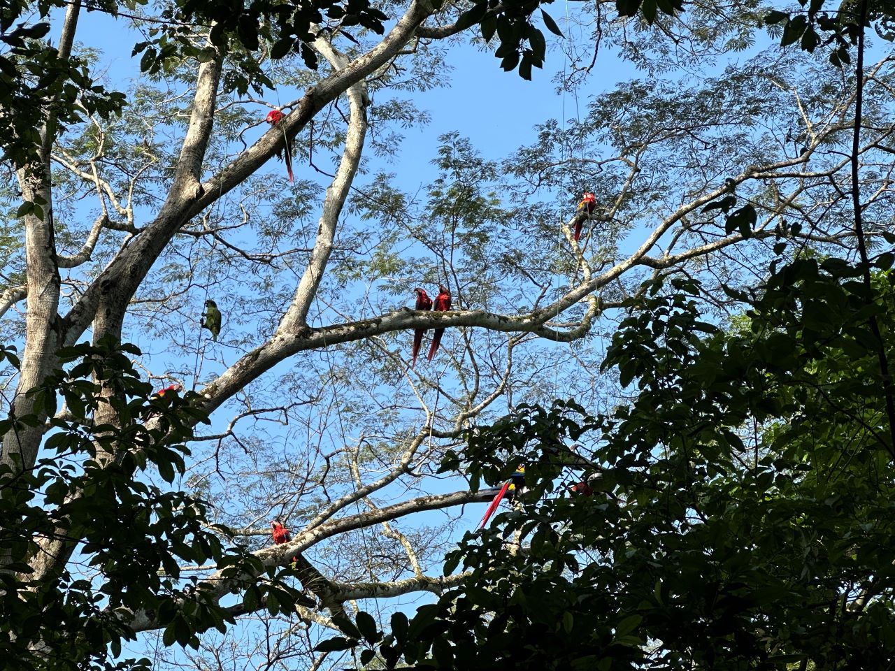 A typical day at Bosque Escondido started at 5:30am (which took some getting used to), and included hiking, collecting data, foraging for natural foods, creating enrichment, helping with a release, and more. I often started my day with an hour-long cage observation of caged birds or a feeder survey of wild and released birds, which gave me the rewarding opportunity to see many macaws and amazon parrots thriving in the wild. I was also able to help with nest checks of the only successful scarlet macaw nest at the reserve this year, collecting data on anatomical features, body condition, etc., on the adorable chicks.