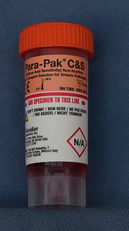 Due to the fastidious nature of C. jejuni, it can be difficult to culture from feces in the laboratory setting. It is recommended to collect a fecal swab in amies transport media with charcoal or Para-pak® C&S (see images below) and send it to the AHDC for overnight delivery in an insulated box with ice packs. Campylobacter jejuni requires its own culture media and specific atmospheric incubation conditions, as it is not reliably recovered from an aerobic culture request; therefore it is a separate test, and the code is CAMPYJ.
