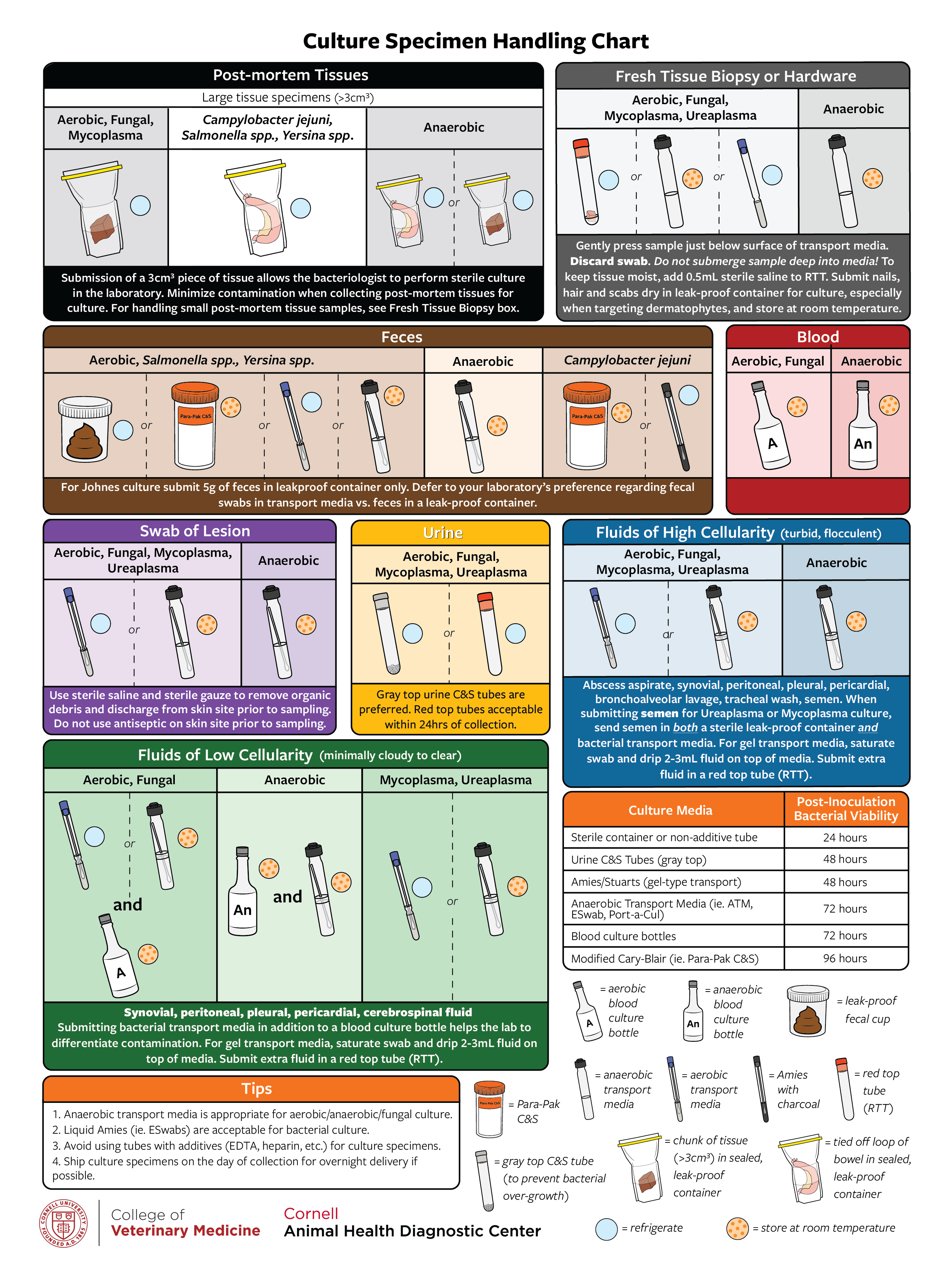 Illustration showing how to collect and store lesion swabs for culture, divided into two sections: “Aerobic, Fungal, Mycoplasma, Ureaplasma” and “Anaerobic.” A key indicates that a light blue circle means refrigerate and an orange circle with darker orange dots means store at room temperature. Container icons identify swabs in aerobic transport media and swabs in anaerobic transport media.
