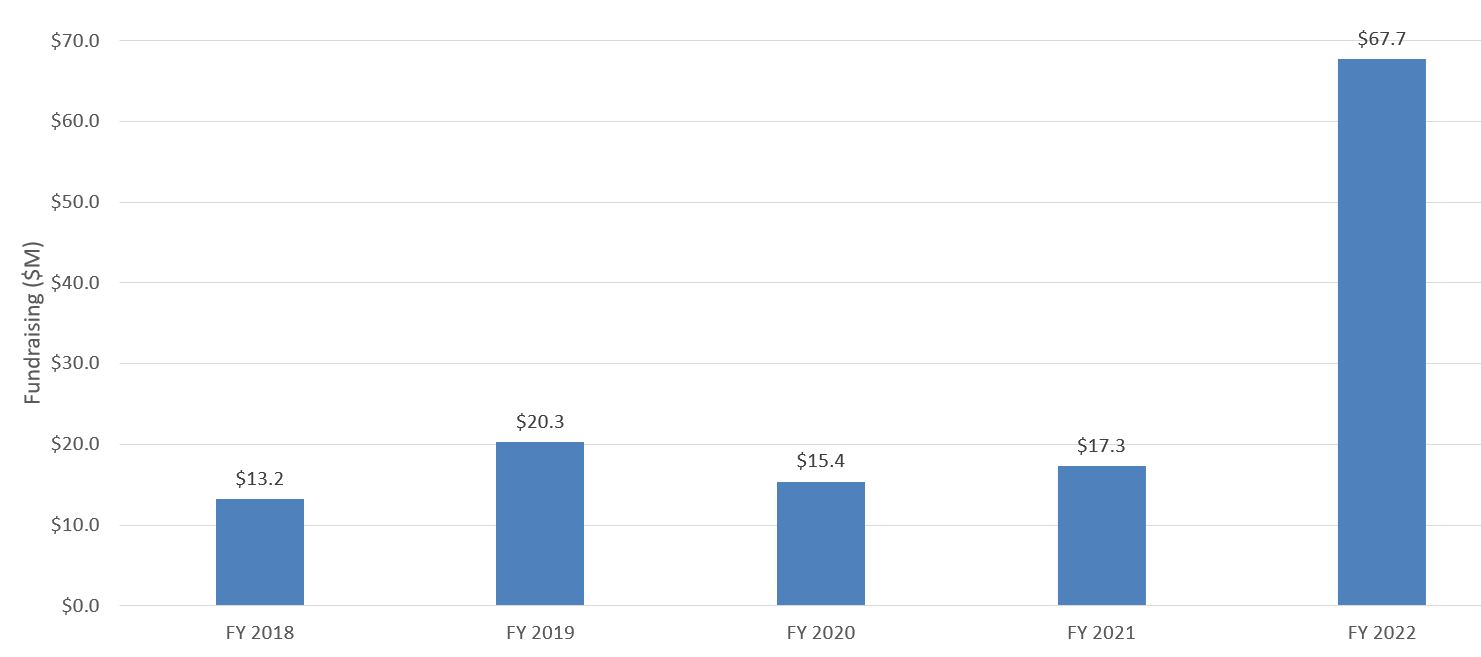 New Gifts and Commitments $M FY18 to FY22 Chart