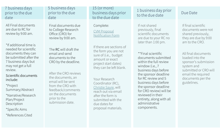 Although OSP policy states scientific documents may be revised until 9:00am on the sponsor deadline day, CVM requires additional time for internal review and processing by the Research Coordinators. Therefore, all final scientific documents must be submitted to your Research Coordinator by 1:00 p.m. on the business day prior to the sponsor deadline. Final scientific documents submitted within the full review window (i.e., seven business days before the sponsor deadline for Research Coordinator review and five business days before the sponsor deadline for CRO review) will be reviewed in their entirety, along with all administrative components.